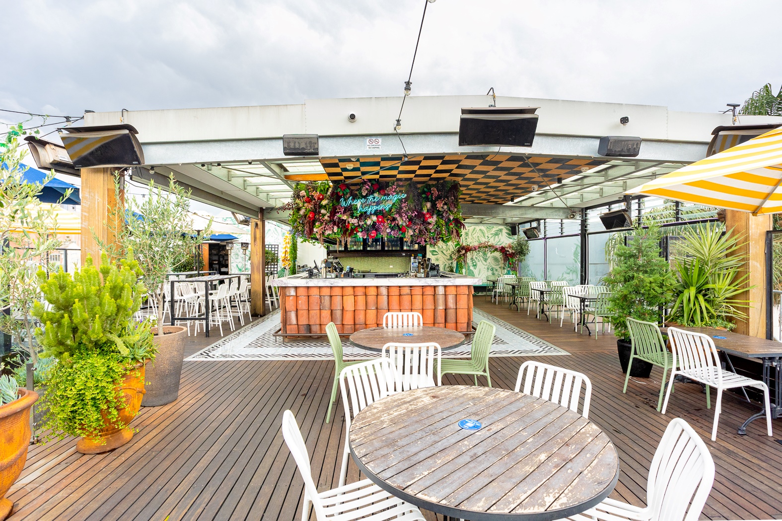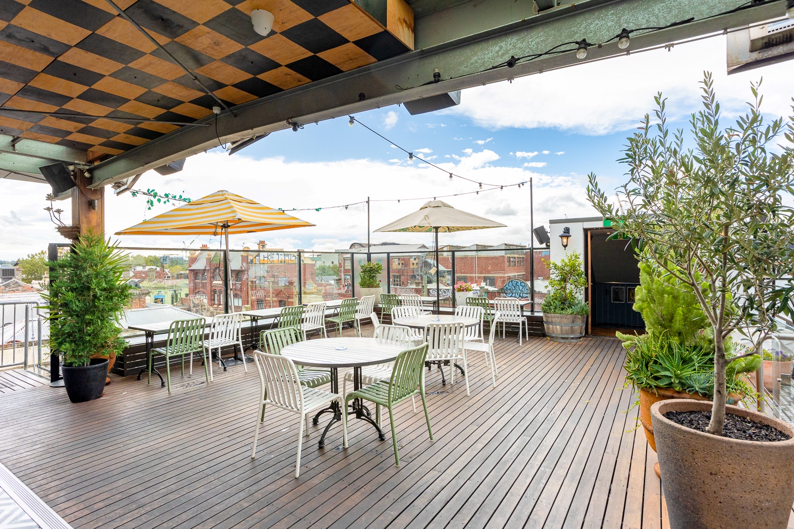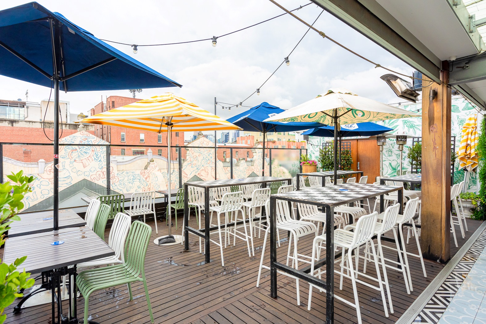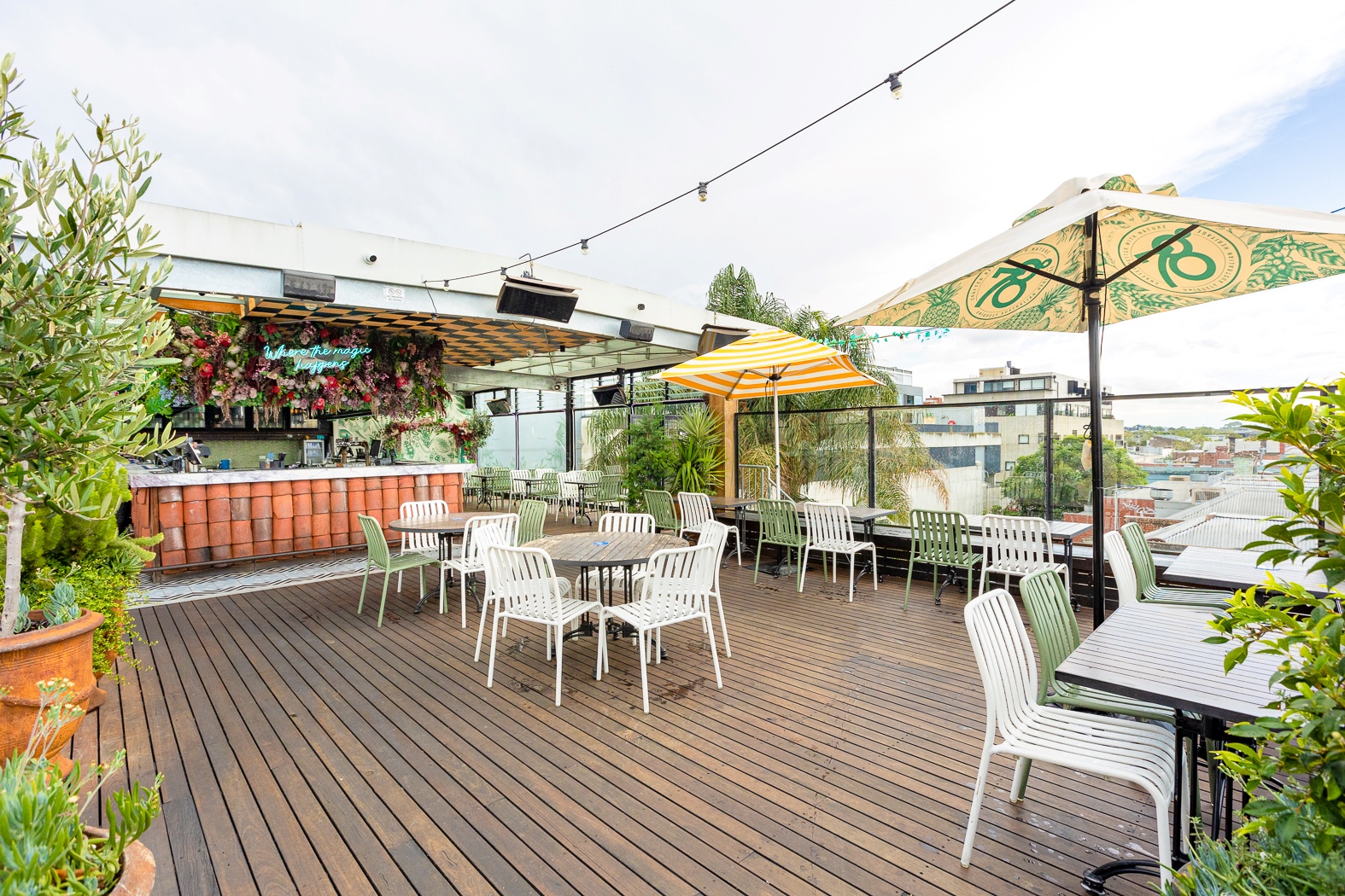 Relaxed but electric, the rooftop boasts stunning sunset views of vibrant Brunswick St below. Surrounded by lush greenery and chic decor, guests can sip on creative cocktails and nibble on our signature menu.